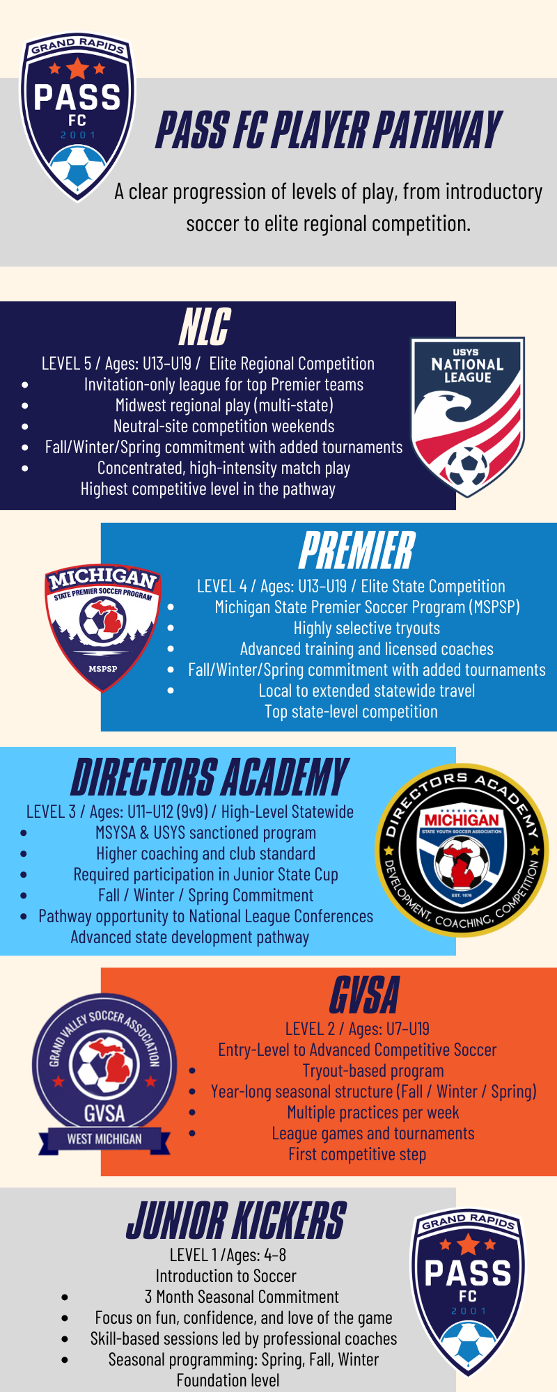 If you are looking to join PASS FC, you may be unsure which league or team fits your player’s development level. PASS tries to form two teams at each age group: one elite team and one developmental team.